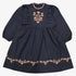 A charming navy dress adorned with terracotta embroidery and vintage-inspired ruffle detailing. The floral motif on the bodice adds a whimsical touch, while the gathered skirt creates a soft, full silhouette. A timeless style with delicate craftsmanship — perfect for fall moments and festive occasions.